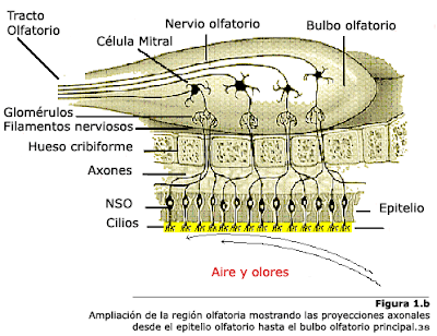 En la pituitaria amarilla, ubicada en la parte superior de las fosas nasales, se encuentran 3 tipos de células, las de sostén o apoyo, las receptoras u olfatorias, y las basales. Los cilios de las células receptoras reciben los estímulos químicos, provenientes de las sustancias volátiles (moléculas) que entran a la nariz y los transforman en impulsos nerviosos que envían al bulbo olfatorio donde son derivados a los centros olfatorios de la corteza cerebral.